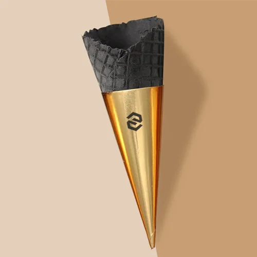 We design aluminum foil cone sleeves in standard and custom sizes. You can choose the right fit for your cones, whether small, medium, or large. Custom sizing is available if your cones fall outside these ranges. Compared to Waffle Cone Sleeves, aluminum foil sleeves adapt better to different cone styles and hold shape under pressure.