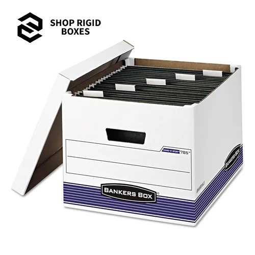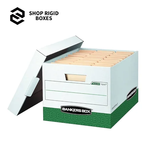 Shop Rigid Boxes offers Banker Storage Box that can be arranged intelligently. Fitted For Strength And Versatility, These boxes are ideal for storing office and stationery, retail products or household goods. The full customization on size, color and design puts you in a position to select the best size, color and design that suits your brand or your personal preference. You will find that our products are environmentally friendly thus making your storage solutions green. These boxes for retail, as well as home use, provide both utility and a pleasing appearance in a single package. Buy today and get additional bulk order discounts.