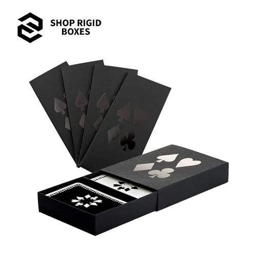Shop Rigid Boxes provides ultimate Black Playing Card Box as affordable and professional packaging solutions for your product. These boxes are of sophisticated and strong construction and have an attractive finish to them. Especially suitable for jewelry, gifts and other kinds of accessories, including costumes, they can be lacquered with your logo, colors and some designs. Using friendly environmental material, these boxes are unique and will appeal to environmentally conscious clients. If you have not yet personalized your packaging now is the time to do so and don’t miss out on our limited-time deals. Stand out with premier, sustainable Black Playing Card Box that puts your products in a league of their own. Book your order now!
