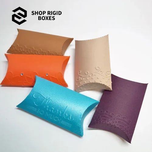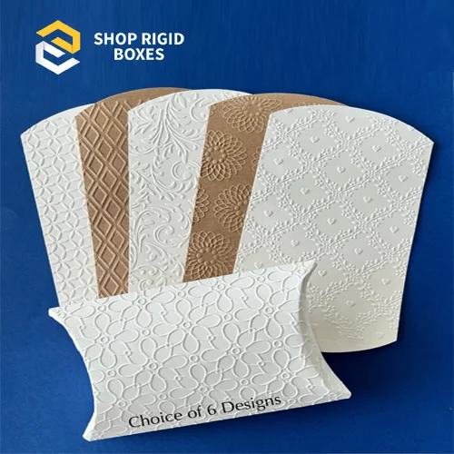 Transform your products with Embossed Pillow Box that are available from Shop Rigid Boxes today. These boxes are designed having raised textures and intermediate designs that deliver a luxurious feel that grabs attention immediately. Our brand boxes for cosmetics, jewellery, and corporate gifts are perfect for luxury brands, cosmetics, jewellery and others. Free-form in terms of size, shape and color, they enable your packaging to fit your branding identically. In addition by focusing on environmentally friendly material, we try to be responsible as we are aesthetically, through sustainable packaging. Furthermore, our Embossed Pillow Box are strong and fashionable enough to make every product a style statement. The availability of special discounts for large orders makes premium packaging more affordable than ever before. Revolutionize your brand and give the customers what they want packaging that looks and feels luxurious.